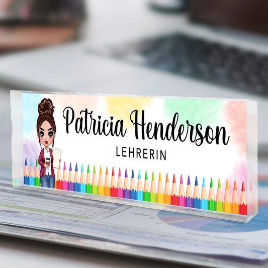 Personalisierte Acryl-Namensplatte – Für Lehrerinnen mit Farbstiftmotiven