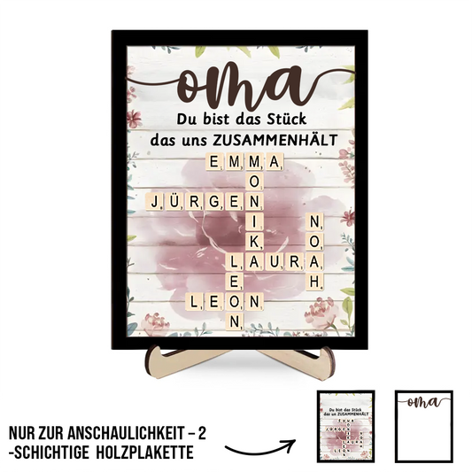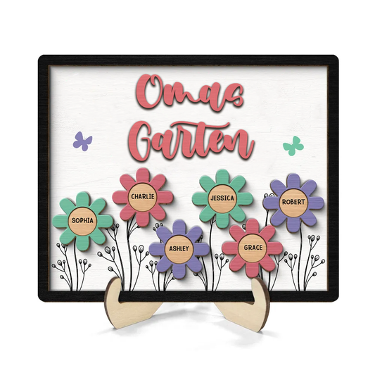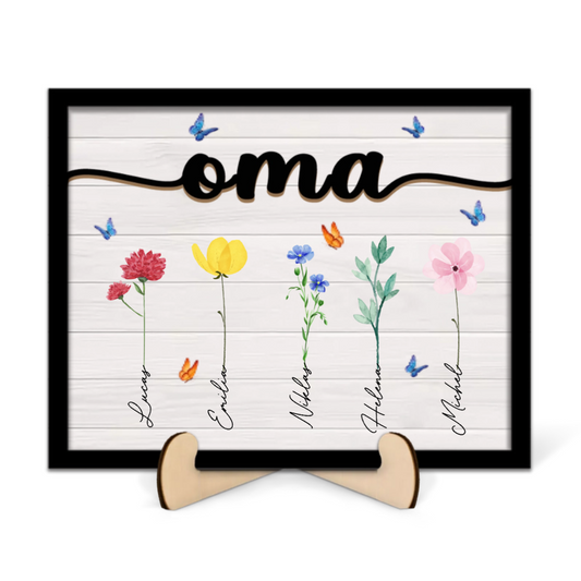 Personalisierte Holztafel mit Blumen und Namen für Oma, Opa, Mama und Papa