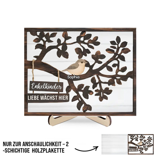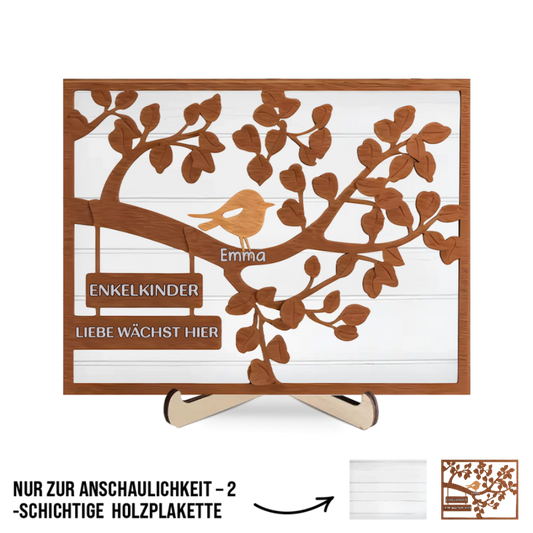 Personalisierte Holztafel mit Baum und Vögeln für Familie und Oma