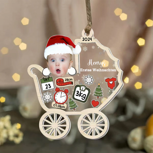 Personalisierter Weihnachtsanhänger „Erstes Weihnachten“ im Kinderwagen-Design