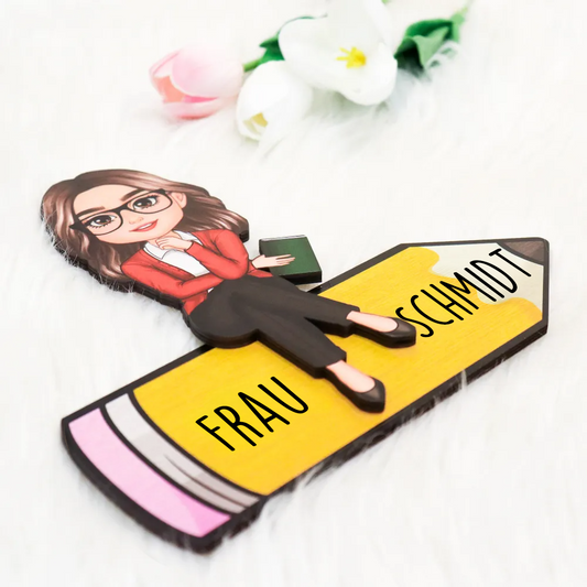 Puppenlehrer/-in auf Bleistift sitzend Personalisierte Holzplakette, Bürodekoration für Lehrer