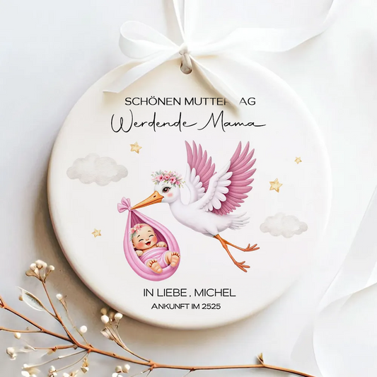 Süßer Storch & Baby – Geschenk für werdende Mamas, personalisierter Keramik-Anhänger