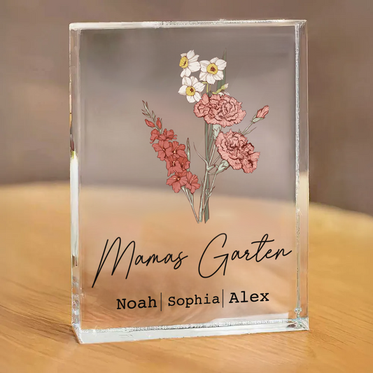 Personalisierter Acrylblock mit Geburtsblumenstrauß, Text und Namen Geschenk für Mama und Oma