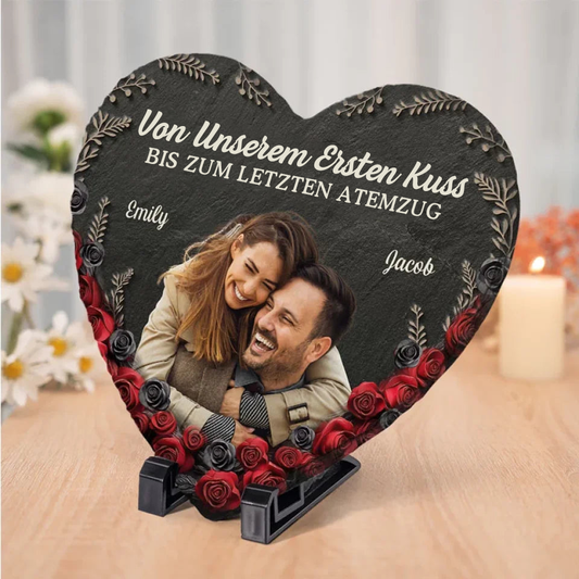 Foto und Rosen - Personalisierte Schieferplatte für Paare – Herzform mit Stand