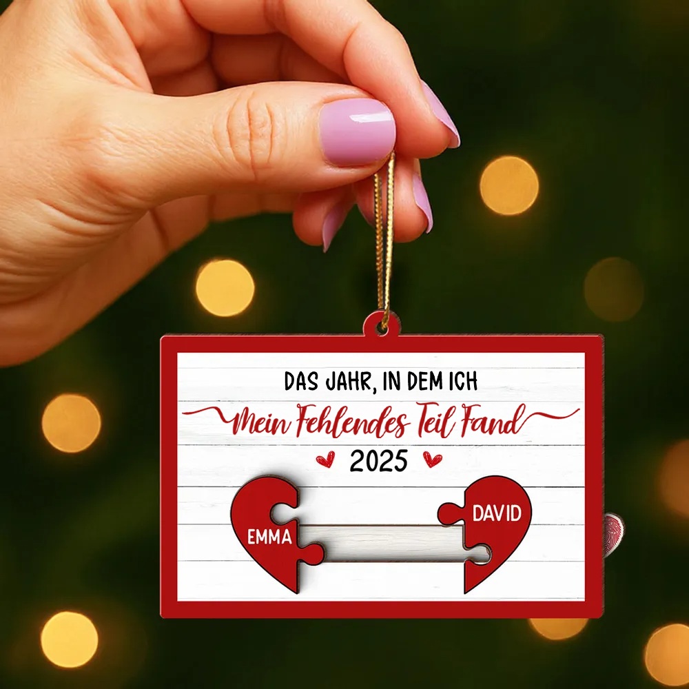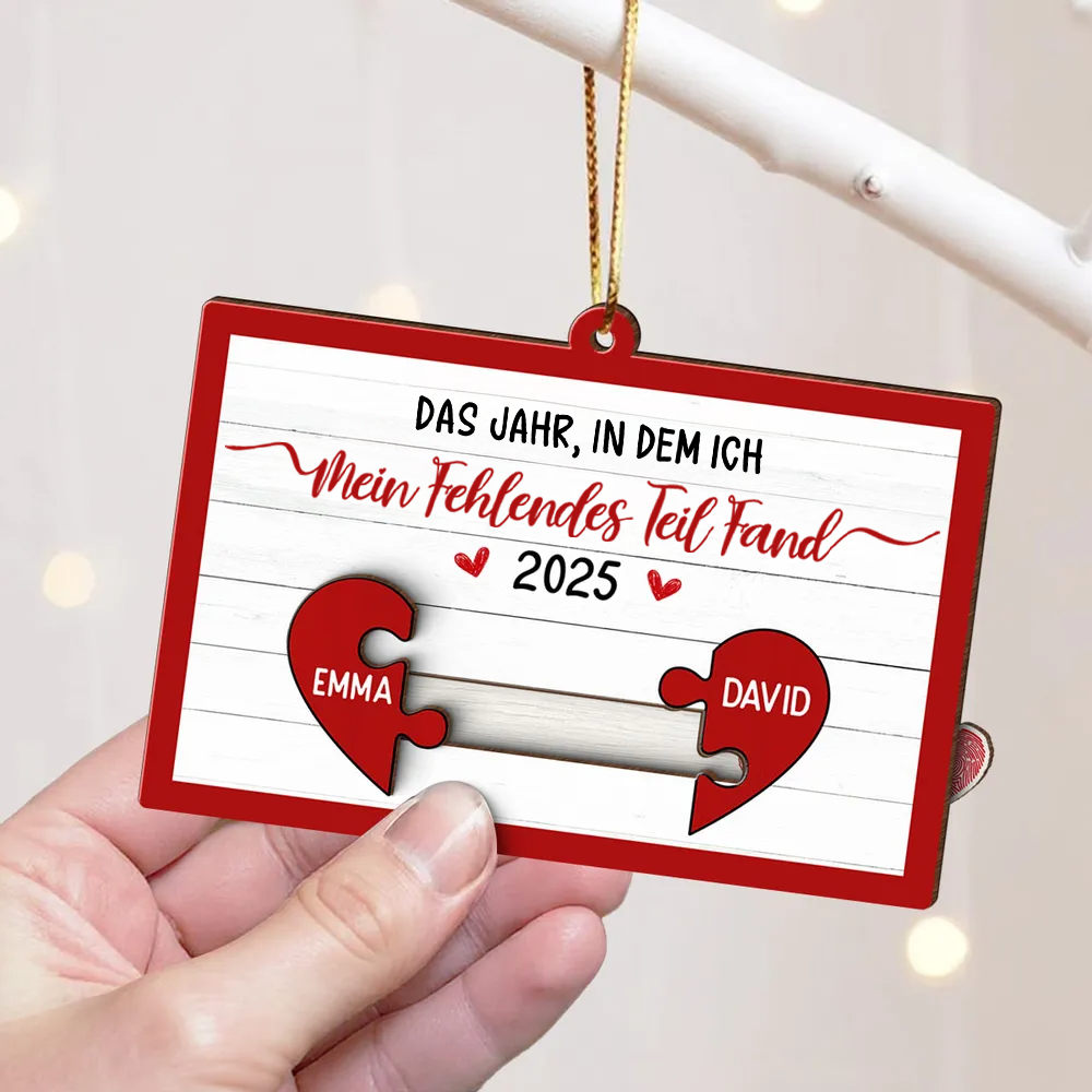 Dieses einzigartige Ornament symbolisiert das Glück, seine andere Hälfte gefunden zu haben – zwei Namen, die sich wie Puzzleteile zusammenfügen, und dahinter ein süßes Motiv eines sich umarmenden und küssenden Paares.