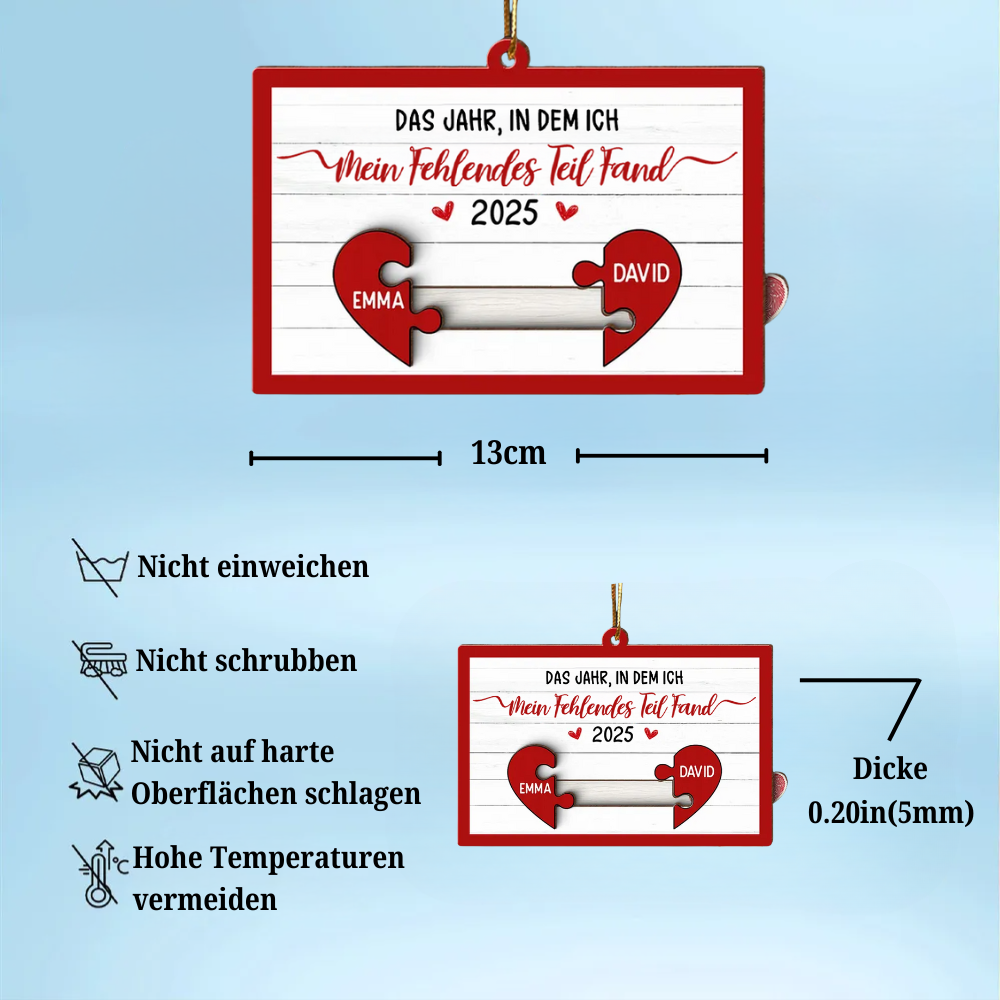 Mit euren Namen und dem Jahr personalisiert, wird dieser Anhänger zu einem romantischen Erinnerungsstück, das euer Weihnachtsfest noch schöner macht. Ein besonderes Geschenk für Paare, Freundinnen & Freunde, das die Geschichte eurer Liebe festhält.