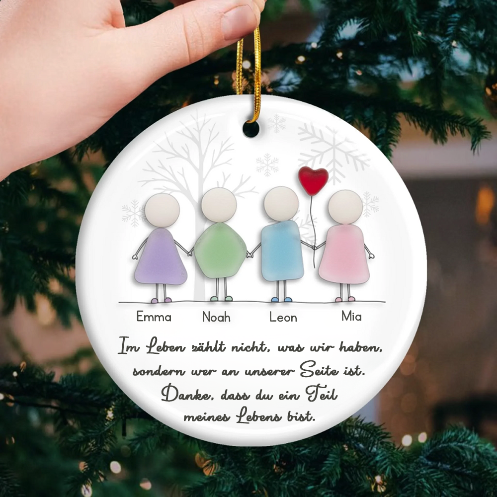 Dieses zarte, kunstvoll gestaltete Ornament zeigt stilisierte Figuren aus Meerglas -Formen und kann mit 2 bis 4 Namen individuell personalisiert werden. Ein wunderschönes Symbol für Zusammenhalt, Familie und besondere Menschen in Ihrem Leben.